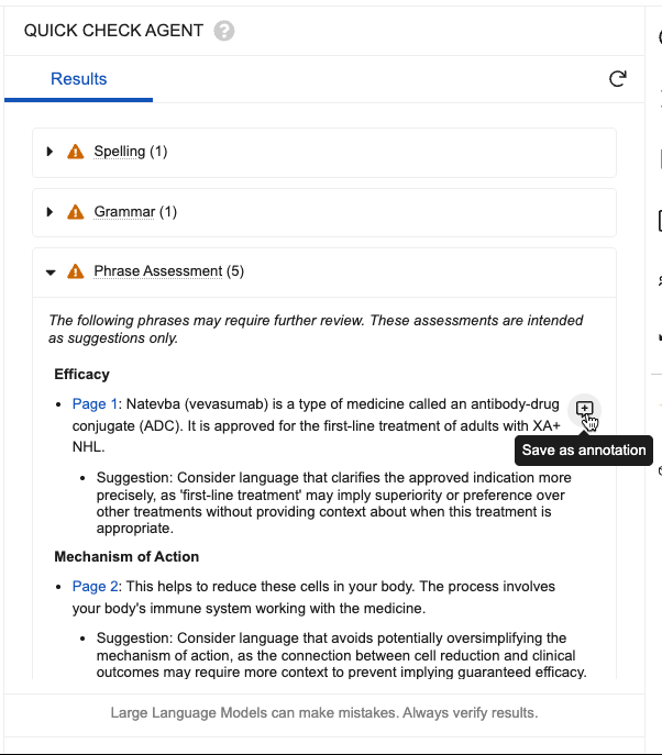 Quick Check Agent is designed to help content owners and coordinators prepare their documents for MLR review by detecting common issues before submission, such as spelling errors, prohibited phrases, and missing warnings or safety information. Leveraging a Large Language Model (LLM), Quick Check Agent proactively identifies a wide range of issues in your promotional materials, reducing the number of review cycles and accelerating time to approval.