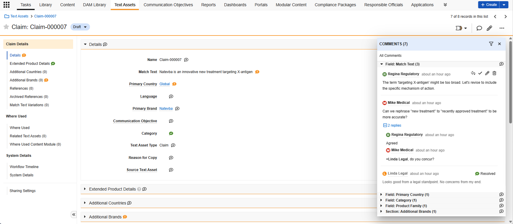 While maintaining your text and claims library in Veeva PromoMats, you can review and provide feedback on a Text Asset directly on the Text Asset record. Users with Read and Atomic Security permissions on the Text Asset Comment (text_asset_comment__v